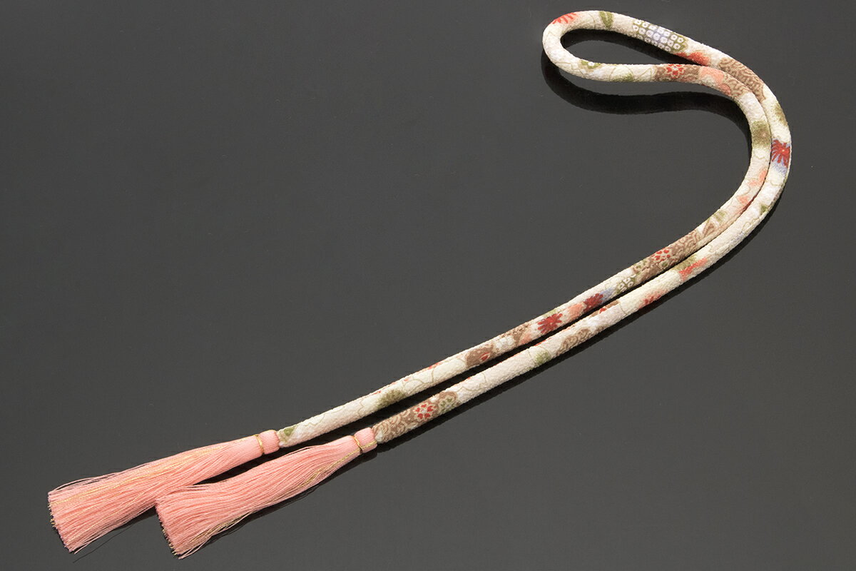 シボのある縮緬生地の桜や梅の花、菊や鹿の子、青海波や七宝繋ぎなどの和柄の丸ぐけ紐の両端には、金色糸が煌めく房飾りが揺れています。