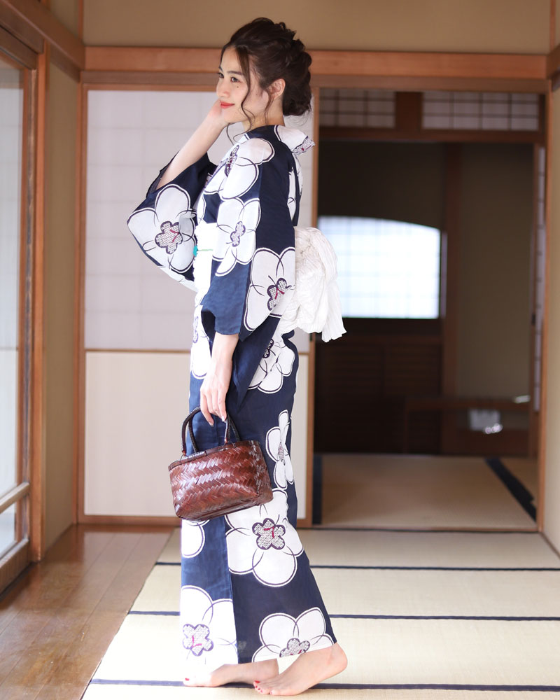 モデルさん着用のコーディネートの浴衣と帯に加えて当店スタッフコーデの下駄を合わせた3点セットです。